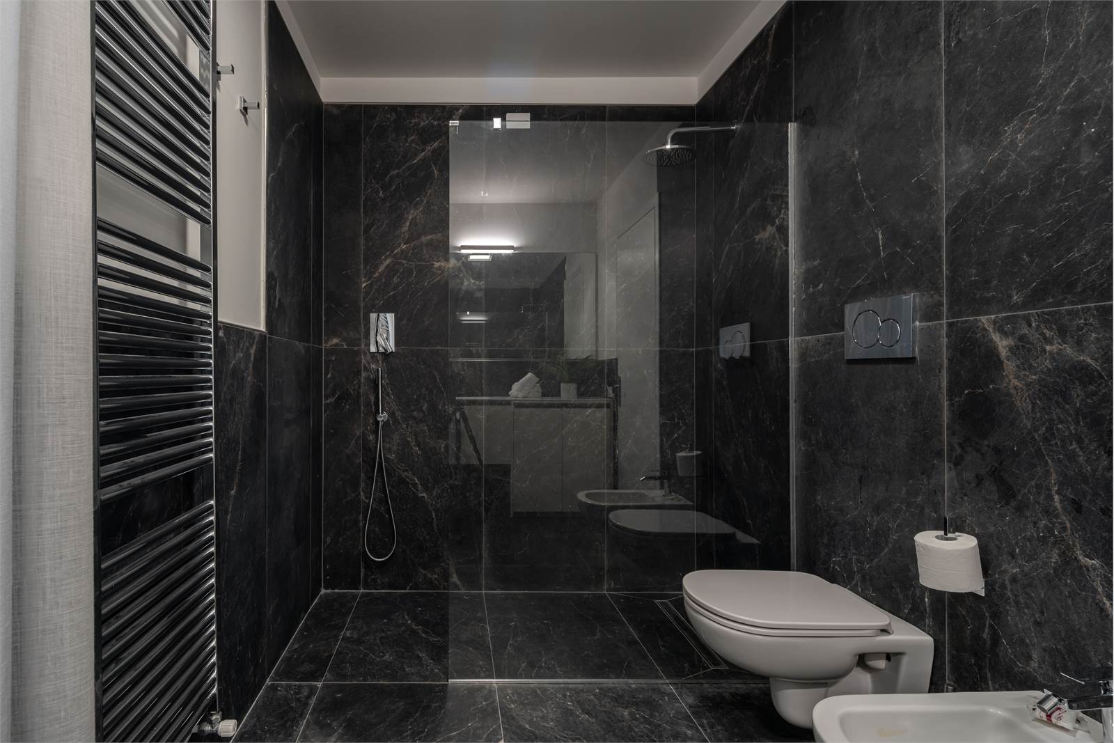 Ampie sale da bagno con ceramiche raffinate e grandi docce walk-in