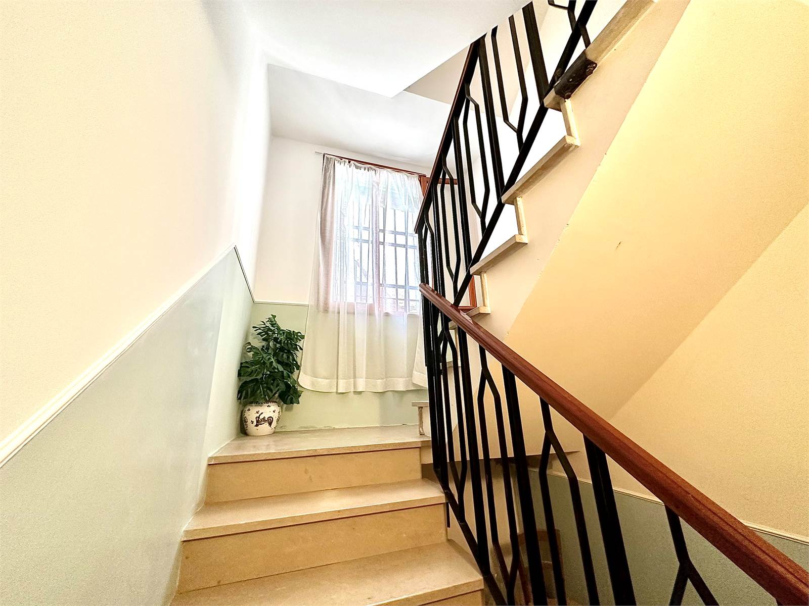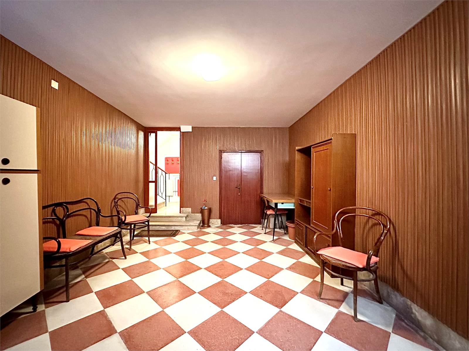 L’accesso alla palazzina avviene al piano terra, l’ampio ingresso di circa 20 mq ospita il vano scale che conduce al piano superiore ed un corridoio dal quale si ha accesso a due ampi magazzini, uno dei quali con possibilità di accesso indipendente. Il corridoio culmina con l’accesso ad una corte esterna ad uso condiviso con l’unità immobiliare adiacente. Le scale realizzate in marmo con corrimano in ferro battuto, ben illuminate da una finestra, portano al primo e secondo piano dell’unità immobiliare.